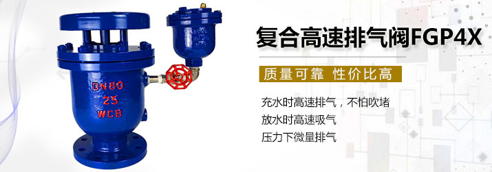 復合式高速進排氣閥安裝于有可能高速進排氣的地方,充水時高速排除管道中的空氣,在管道放空時吸入空氣保持排水通暢,管道正常工作時可以不斷地排除析出的空氣。在有可能產生水錘的時候使空氣自動進入,避免產生負壓,防止或減緩水錘的危害。