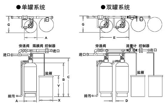 2、雙罐系統(tǒng)——使用軟化水再生,這種配置適合于洗衣房、賓館飯店、大型食品加工廠等用水量波動較大的場合。