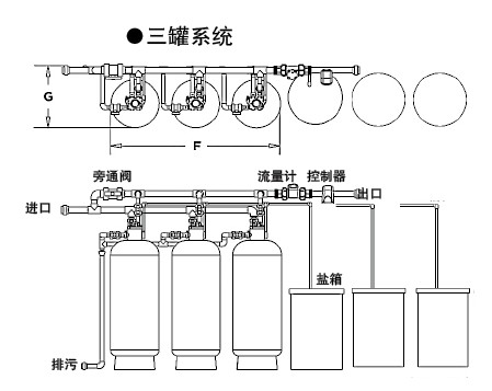 3、三罐系統(tǒng)——使用軟化水再生,一個罐再生時對整個系統(tǒng)壓力水量的影響很小,適合像鍋爐補水等對水質(zhì)和鹽耗要求較高的連續(xù)大水量軟化應用。