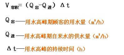 3、表中所推薦的穩(wěn)壓補(bǔ)償器的規(guī)格是根據(jù)一般情況估算的,如果進(jìn)水量不能滿(mǎn)足用水高峰的要求,需要重新計(jì)算穩(wěn)壓補(bǔ)償?shù)娜莘e,公式如下: