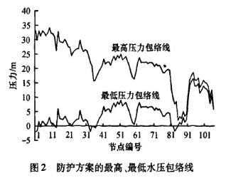 在節(jié)點(diǎn)設(shè)置復(fù)合式排氣閥后,系統(tǒng)發(fā)生停泵水錘時(shí)輸水管最高、最低壓力見表2,最高、最低壓力包絡(luò)線見圖2。
