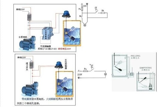 2、使用“黑色”和“藍色”的電線:浮球在下水位時,接點是接通的狀態(tài),浮球在水位時,接點是不通的狀態(tài)。